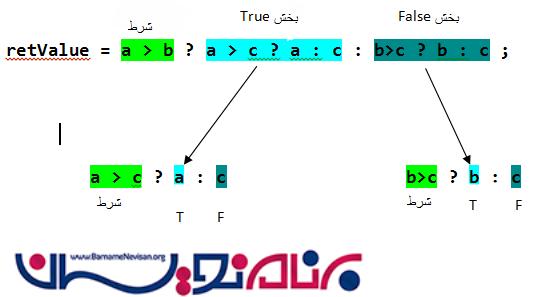 این شکل، روش کار در عملگرسه تایی را نشان می دهد. مقدار هر دو بخش False و True به متغیر برگردانده می شود که این مقدار بر اساس شرط می باشد.