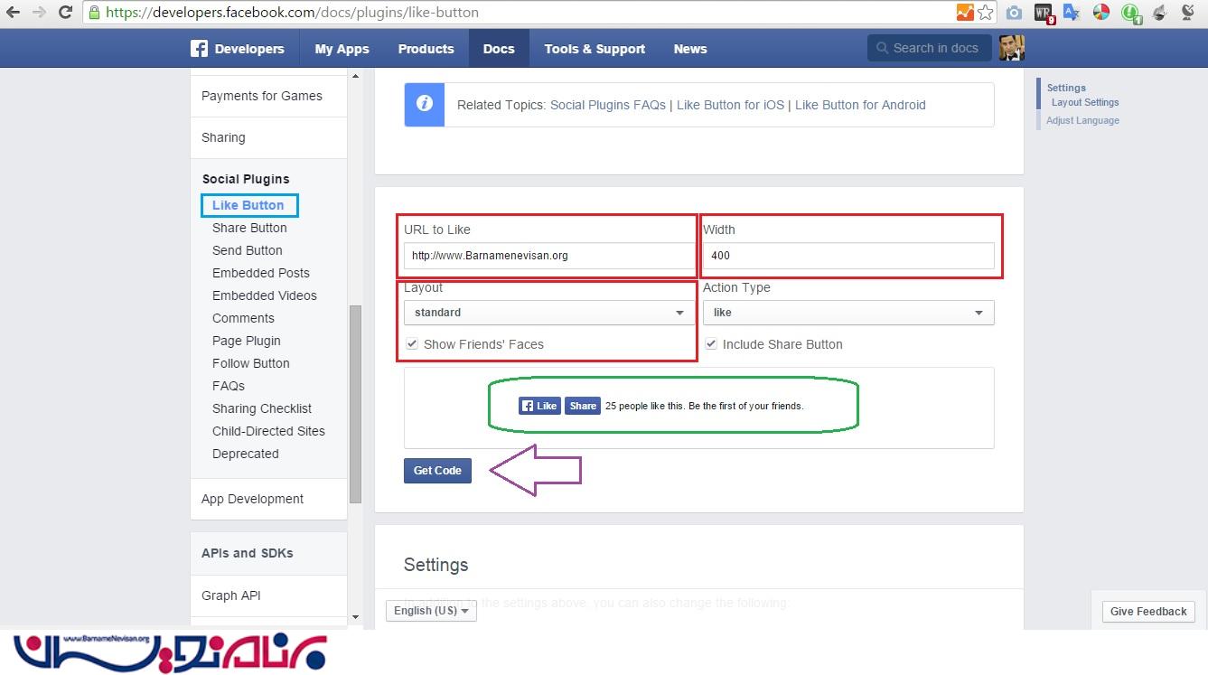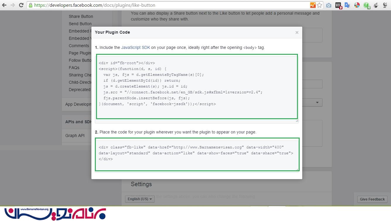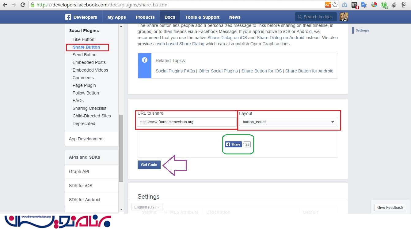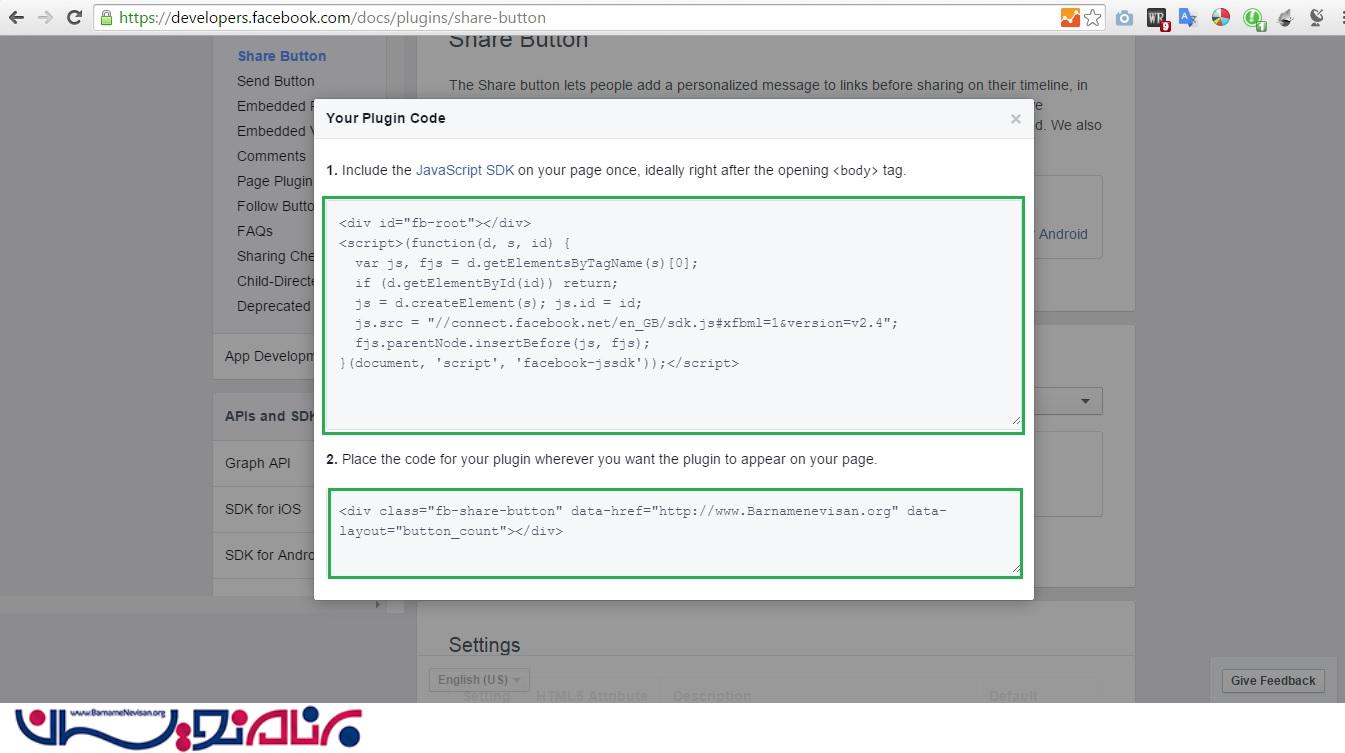 برای افزودن کلید Share دوباره سایت Facebook را باز می کنیم.و مانند نظرات و لایک قسمت های مشخص شده در تصویر را وارد می کنیم.