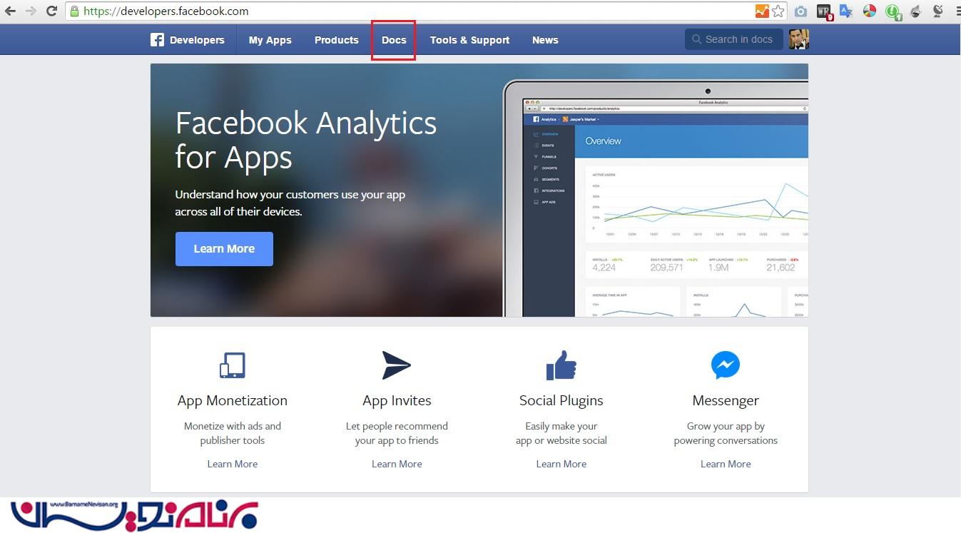 https://developers.facebook.com و سپس مانند شکل زیر به منوی Docs می رویم.