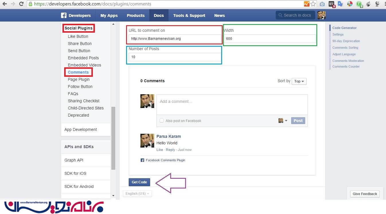 در شکل فوق در کادر قرمز آدرس وبسایت ، در کادر سبز طول قسمت نظرات و در کادر آبی تعداد نظرات را می توان مشخص کرد ، سپس بر روی Get Code کلیک می کنیم.