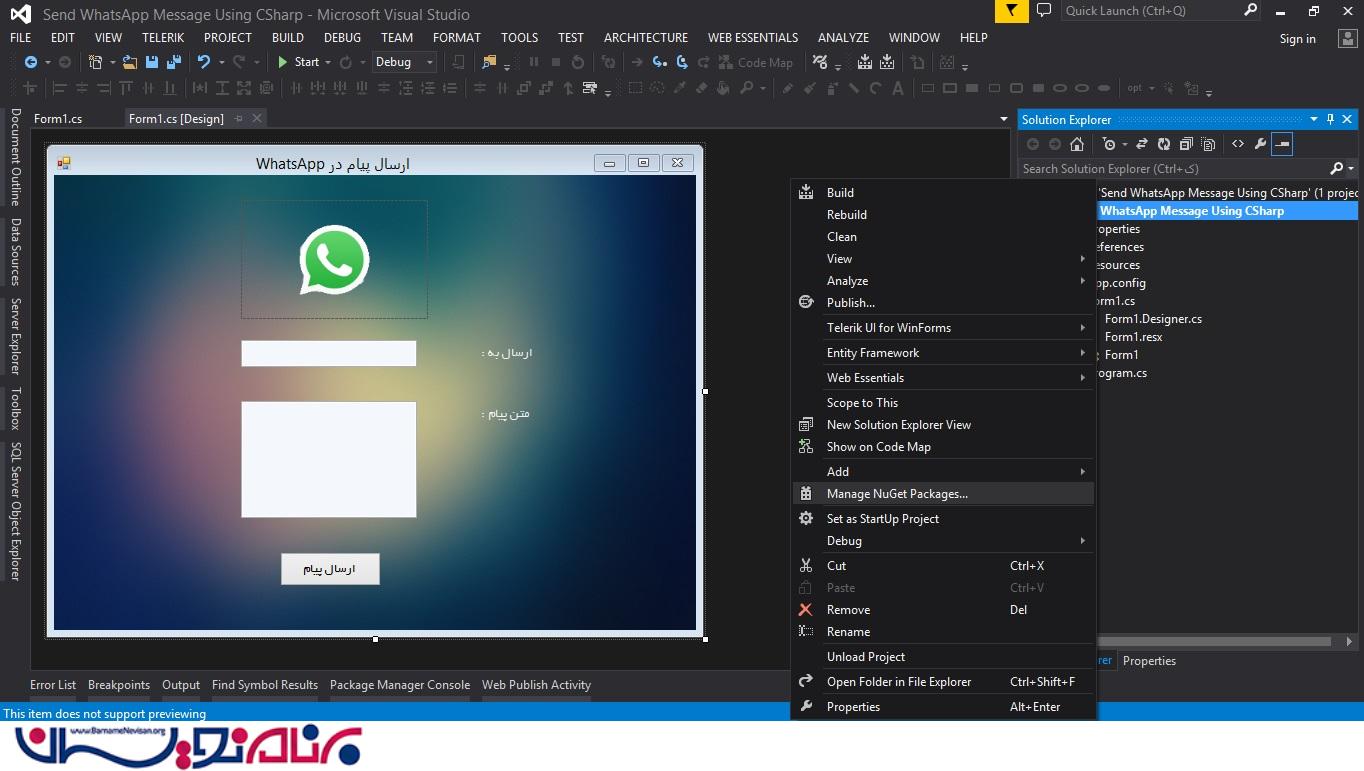 بر روی پروژه در Solution Explorer کلیک راست می کنیم و سپس بر روی Mannage Nuget Package Mannager... کلیک می کنیم.