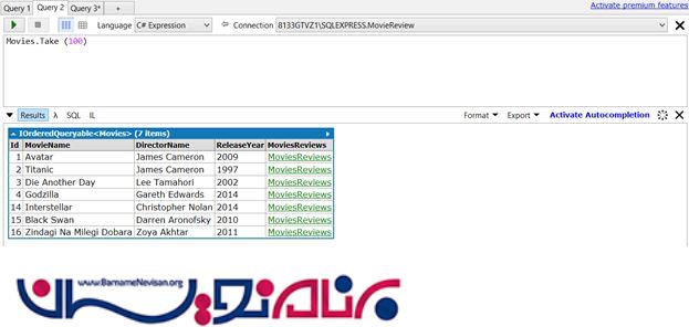 اگر ما به دیدن ارتباط بین جدول ها نیاز داشته باشیم، به راحتی می توانیم بر روی لینک های highlight شده، کلیک کنیم. مثلا در این مورد، وقتی که روی "MovieReviews" کلیک می کنیم، نتیجه زیر حاصل می شود.