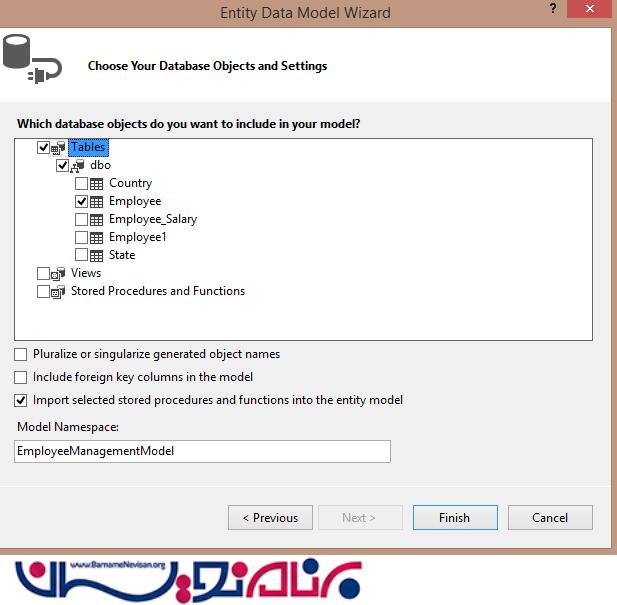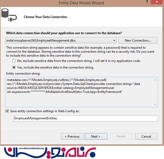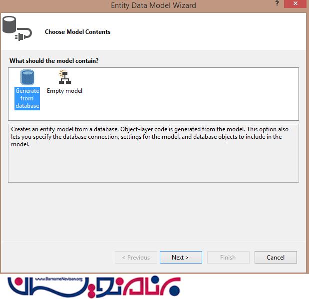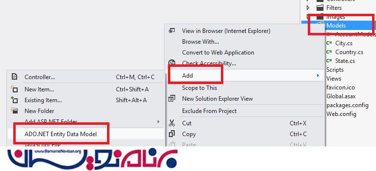 حالا مانند شکل مدل خود را از طریق Add ADO.NET Entity Data Model به برنامه اضافه می نماییم. برای این کار در Soloution Exxplorer روی Models راست کلیک کرده و Add ADO.NET Entity Data Model را کلیک می نماییم.