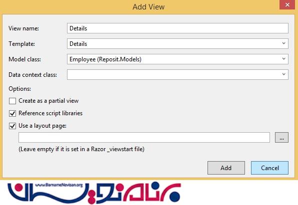 حالا روی متد Detail کلیک راست کرده و یک ویو از نوع Detail با کلاس Employee ایجاد نمایید.