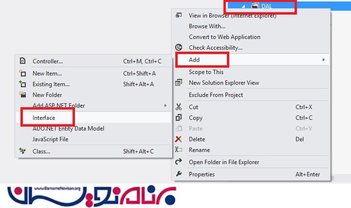 روی پوشه ساخته شده کلیک راست کرده و Add->Inteface را می زنیم. Inteface را IEmployeeRepository نامگذاری می نماییم.