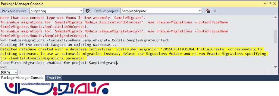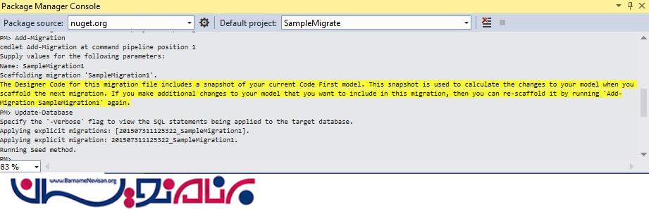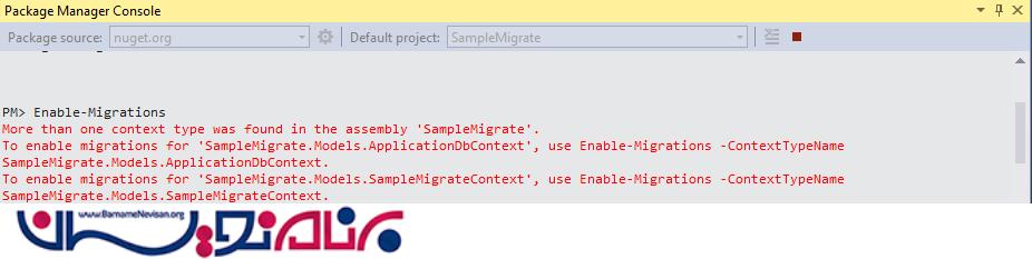 در اینجا SampleMigrate نام پروژه است و شما باید به جای آن نام پروژه خود را جایگزین آن نمایید.