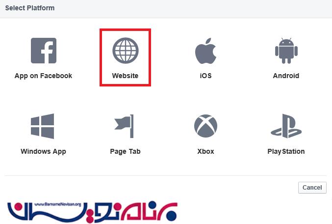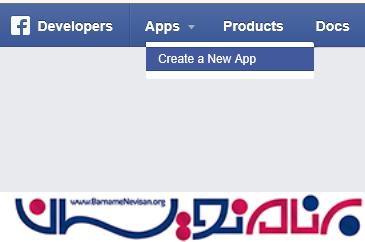 ابتدا به سایت https://developers.facebook.com/apps می رویم و در آنجا بر روی Register as a Developer کلیک می کنیم.سپس مانند شکل بر روی App و در منوی باز شده بر روی Create New App کلیک می کنیم.