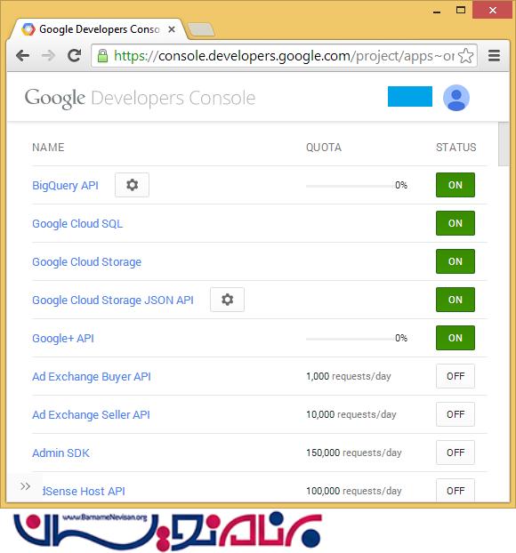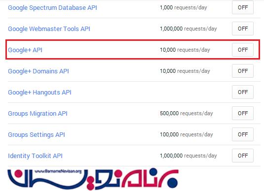 حال بر روی APIs menu item کلیک می کنیم و به پایین صفحه میاییم و بر روی گزینه Google+ API کلیک می کنیم تا از حالت off به on تبدیل شود.