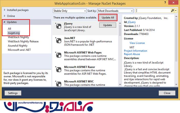 با استفاده از Nuget Package Manager اقدام به Update تمامی پکیج ها می کنیم.