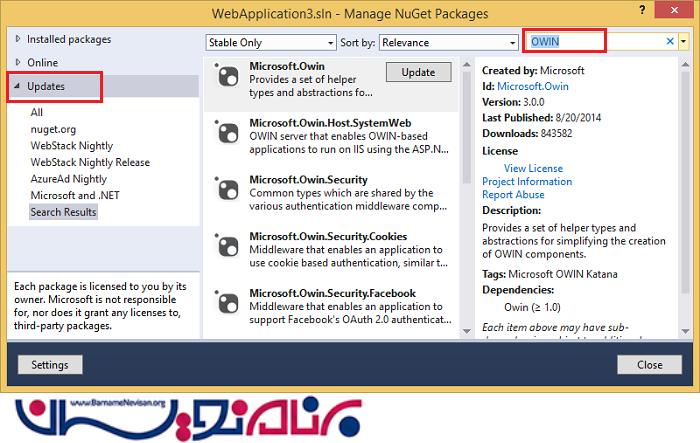 بعد از آن اقدام به نصب یا به روزرسانی Owin می کنیم تا بتوانیم از Api های دیگر حساب ها نیز استفاده کنیم ، اگر نصب بود آن را به روز رسانی می کنیم در غیر این صورت اقدام به نصب آن می کنیم.