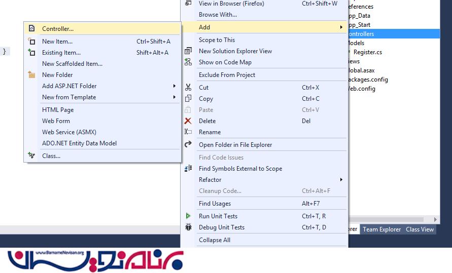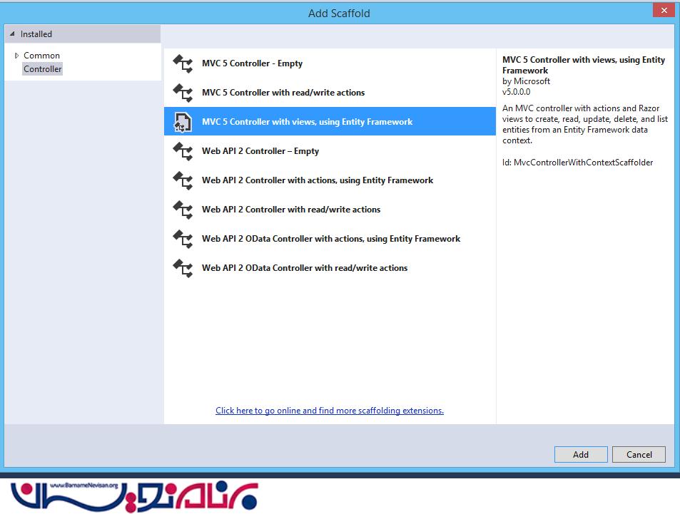حال در قسمت کنترلر راست کلیک کرده و یک کنترلر از نوع using Entity Framework MVC5
