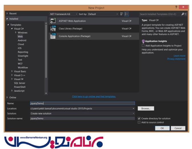 ویژوال استادیو را باز کرده و یک پروژه از نوع ASP.NET web application ایجاد میکنیم.
