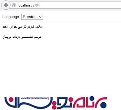 حال اگر برنامه را اجرا کنیم، محتوای صفحه به زبان فارسی نشان داده می شود و زبان فارسی به عنوان زبان انتخاب شده در DropDownList نمایش داده می شود.