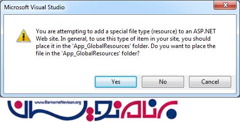 به محض اینکه، اولین فایل را اضافه کنیم، پیامی به شکل زیر ظاهر می شود که از ما می خواهد فولدری به نام App_GlobalResources اضافه کنیم، بنابراین روی دکمه Yes کلیک می کنیم.