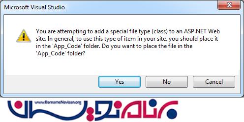 به محض ایجاد کلاس، پیامی به شکل زیر ظاهر می شود که از ما می خواهد فولدری به نام App_Code اضافه کنیم، بنابراین روی دکمه Yes کلیک می کنیم.