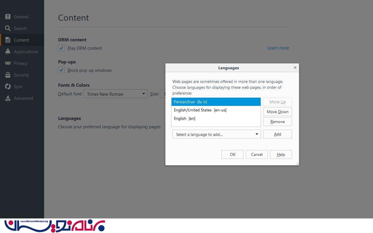 توجه داشته باشید که تصویر بالا، مربوط به مرورگر فایرفاکس می باشد و اگر از مرورگر دیگری استفاده می کنید، با کمی تفاوت می توانید زبان پیش فرض دلخواه خود را اضافه کنید.