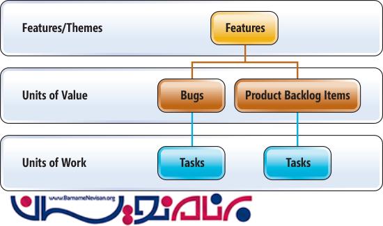 عموماً یک Feature مقدار کاری است که آغازگر iteration است، PBIs واحدهای مقادیر مشتری است که در یک iteration می تواند انجام شود، task واحدهای کاری است که ممکن است انجام آنها چند روز طول بکشد. استفاده از آنها این امکان را به شما می دهد که کارهای خود را به چندین کار تقسیم کنید، چه در حد نمونه کار و یا با جزییات بیشتر.
