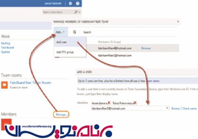 بعد از ساخت حساب کاربری و انتخاب Team Project خود، حال باید اعضای تیم خود را اضافه کنید. قبل از این کار، توجه داشته باشید که هر یک از اعضا باید یک حساب کاربری مایکروسافت داشته باشند. برای این کار شکل زیر را دنبال کنید.