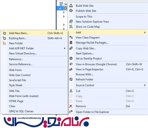 مانند تصویر زیر در Solution Explorer روی پروژه قرار گرفته، راست کلیک کنید و گزینه Add New Item را انتخاب کنید.