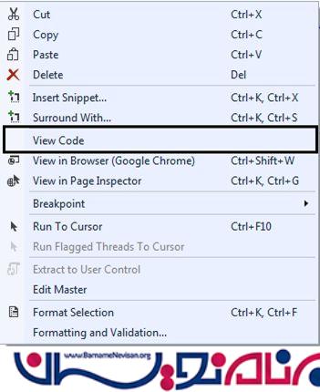 روی page design راست کلیک کنید و روی گزینه View Code کلیک کنید.
