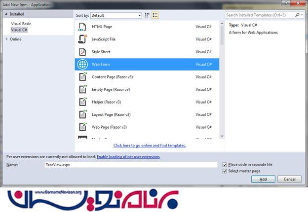 حالا یک کنترل TreeView در صفحه aspx. مانند زیر اضافه کنید.
