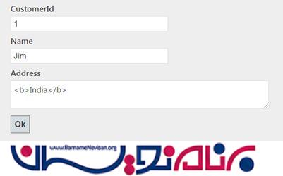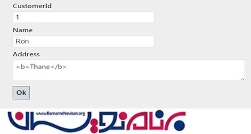 بعد از تنظیم این صفت، خطای قبلی دیگر رخ نمی دهد. اما به جای آن سعی می کند اسکریپت های وارد شده در Textbox را اجرا کند. این تنها زمانی درست است که view ما از نوع aspx. باشد.