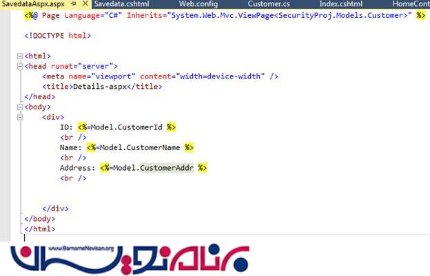 به یاد داشته باشید زمانی که از Razor Engine استفاده می کنید با کد گذاری داده ها به عنوان یک رفتار پیش فرض از حمله Cross Site Scripting جلوگیری می شود. اما با Aspx engin حمله Cross Site Scripting به عنوان یک رفتار پیش فرض ممکن است.