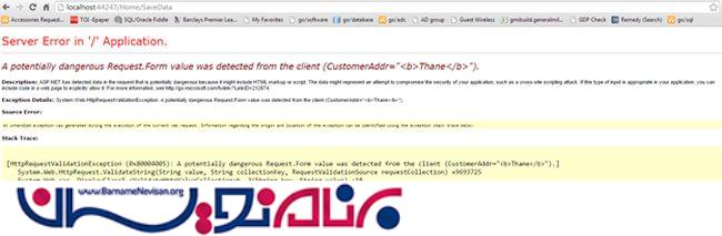زمانی که سعی کردیم تگ <b> را وارد کنیم، با این خطا مواجه شدیم. که این خطا می گوید، فردی سعی دارد، اسکریپت خطرناکی وارد کند. این تهدید به سادگی توسط Net Framework. مدیریت می شود.