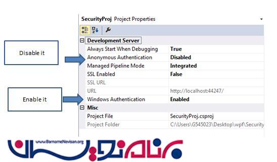 2.به طور پیش فرض Windows Authentication غیر فعال می باشد. به properties پروژه بروید و آن را enable کنید