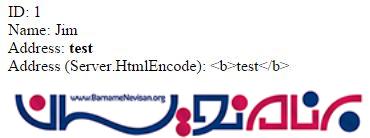 برای چاپ خروجی به شکل بالا، نیاز داریم که از متد ()Server.HtmlEncode به صورت زیر استفاده می کنیم.