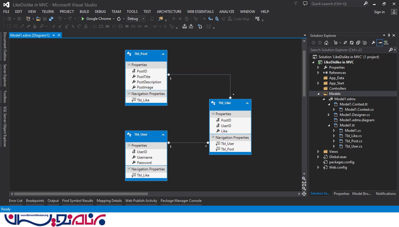 پس از برقراری ارتباط با سرور یا سیستم لوکال و اضافه کردن جداول دیتابیس به مدل تصویر زیر که مدل اضافه شده است را مشاهده می کنید.