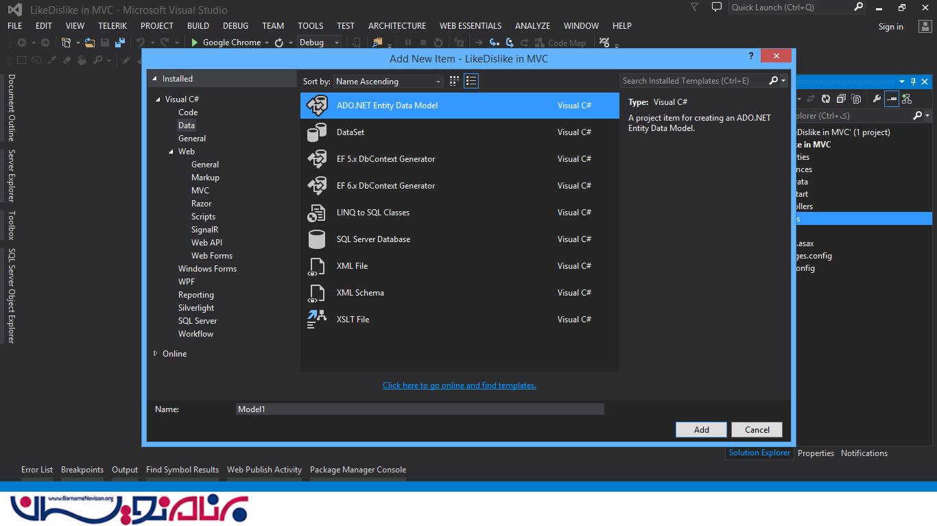 و در این قسمت گزینه Ado.net Entity Data Model را اضافه می کنیم.