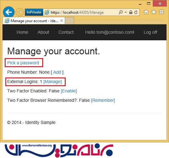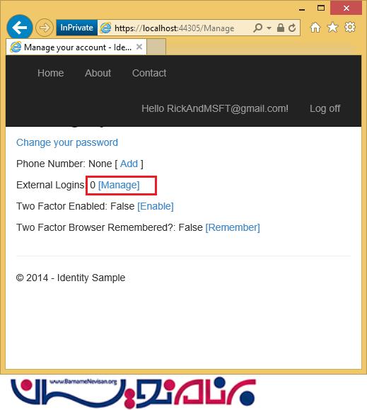روی لینک Manage کلیک کنید. می بینید که External Logins (ورود خارجی) برای این اکانت 0 است.