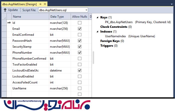 در Server Explorer پروژه به مسیر Data Connections\DefaultConnection\Tables\AspNetUsers بروید و راست کلیک کرده و Open table definition را انتخاب نمایید.