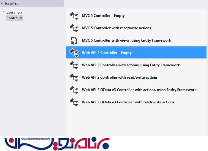 روی پوشه کنترلر راست کلیک کرده و یک Web API 2 controller مانند زیر ایجاد می کنیم.