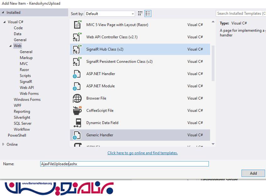 با راست کلیک کردن روی نام پروژه و انتخاب گزینه generic handler یک generic handler با نام AjaxFileUploader.ashx به برنامه اضافه می نماییم.