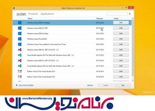 بعد از نصب این برنامه شما متوجه می شوید که این برنامه همانند یک store app برای ابزار اینترنتی و سایر برنامه هایی است که شما ممکن است آن ها را نیز برای توسعه وب بخواهید. بعد از انتخاب گزینه yes دانلود و سپس نصب شروع می شود و به web platform installer وصل می شویم.