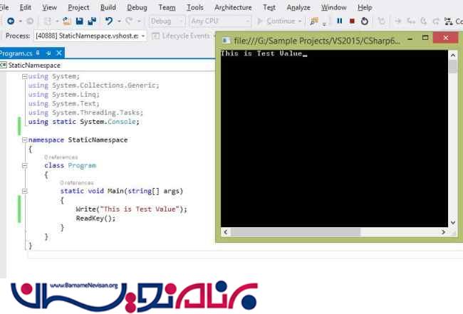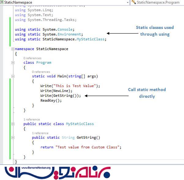معمولا، زمانی که کلاس های static با متدها را داریم، متدها را با استفاده از staticClassName.MethodName فراخوانی می کنیم. اما با ویژگی جدید در C# 6.0 می توانیم به طور مستقیم این متدها را فراخوانی کنیم. مثل اینکه قسمتی از همان کلاس هستند به جای استفاده staticClassName.MethodName. در ادامه مشاهده می کنید که چطور این کار را انجام می دهیم.