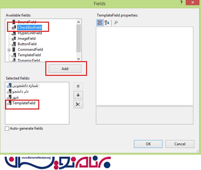 برای قرار دادن checkbox در Gridview روی فلش کنار آن کلیک کرده، Edit columns را انتخاب می کنیم. در منوی سمت چپ، CheckBoxField را انتخاب می کنیم.