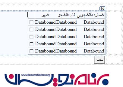 برای این کار از checkbox در GridView و یک button استفاده می کنیم. کاربر سطرهایی که می خواهد حذف کند، از طریق checkbox در GridView انتخاب می کند و سپس با کلیک کردن بر روی button این سطر، از GridView و همچنین دیتابیس حذف می شود.
