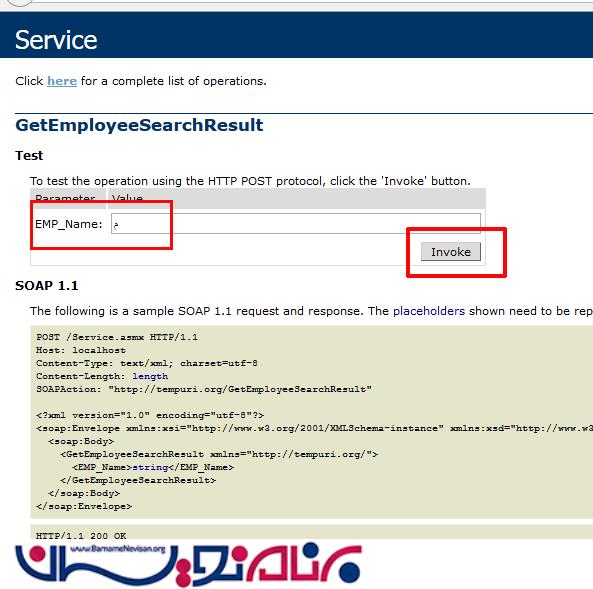 حال برای تست وب سرویس، اپلیکیشن خود را اجرا می کنیم و روی نام متد خود کلیک می کنیم: