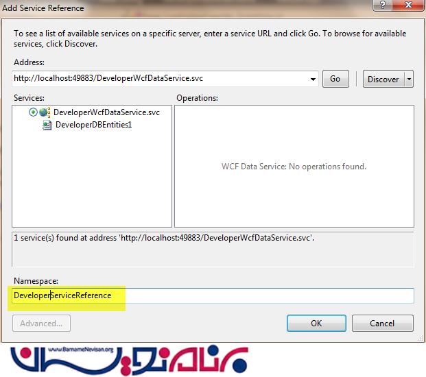 برای استفاده از WCF Data Service باید یک Service Refrence اضافه کنیم. برای این کار روی فولدر Refrences راست کلیک کرده و Add Service Refrence را انتخاب می کنیم و در پنجره باز شده روی Go کلیک می کنیم. از این پس، Data Service در برنامه قرار می گیرد و به طور اتوماتیک URLها را واکشی می کند.