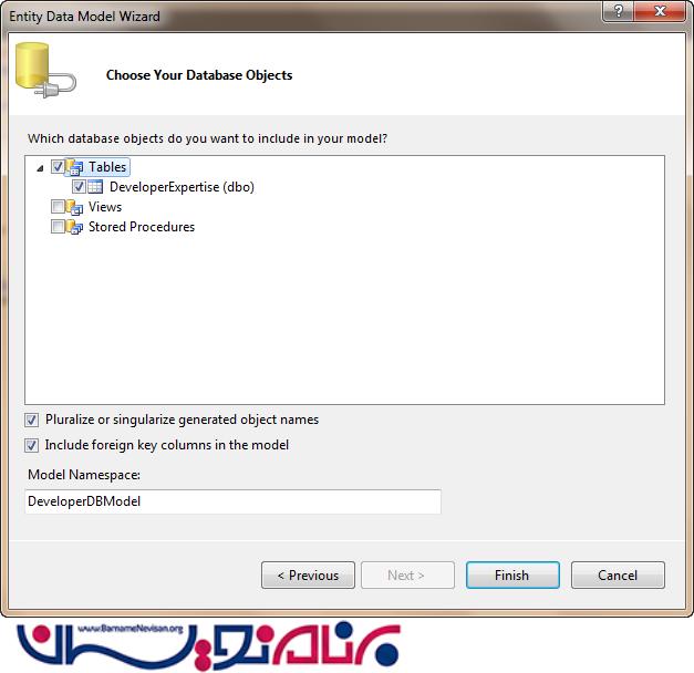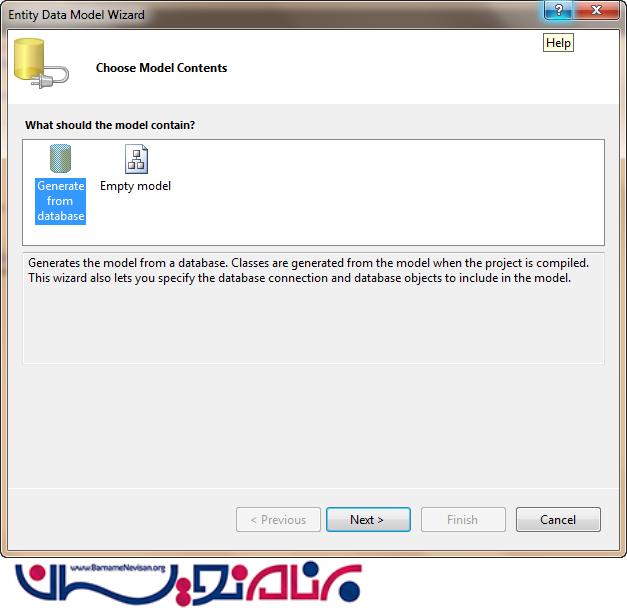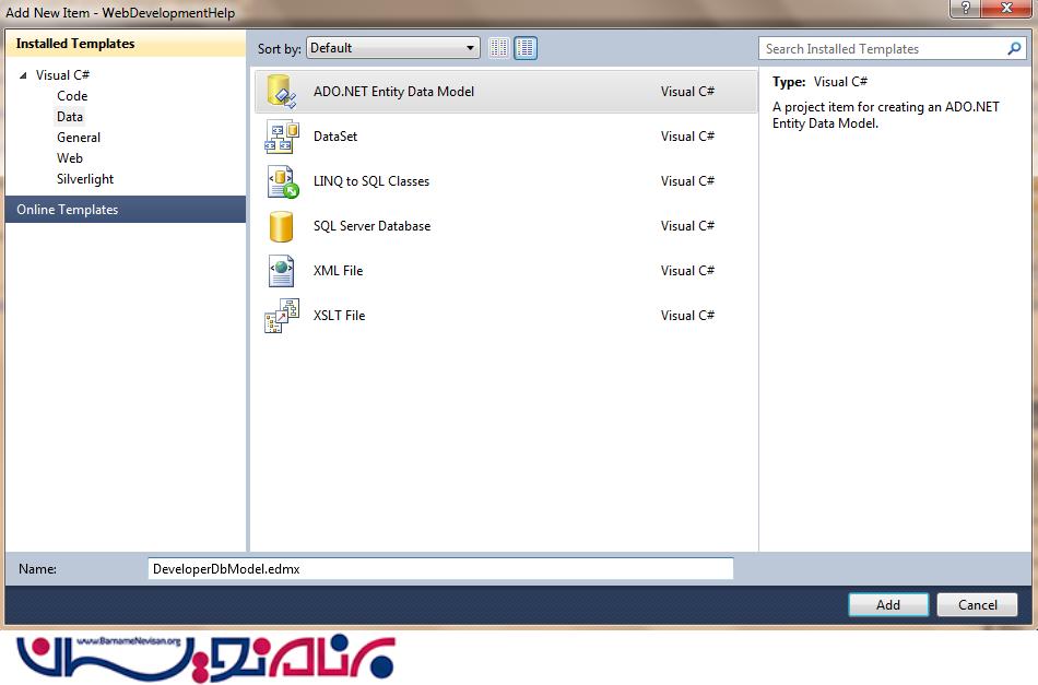 جدول دیتابیس ما نیز آمده شده است. حال وقت آن است که یک Entity Data Model ایجاد کنیم. برای این کار روی نام پروژه در solution Explorer راست کلیک کرده، Add New Item را انتخاب و سپس روی ADO.Net Entity Data Model کلیک می کنیم. سپس یک Wizard مانند تصاویر زیر باز می شود که با استفاده از آن می توانیم Data Model خود را بسازیم.