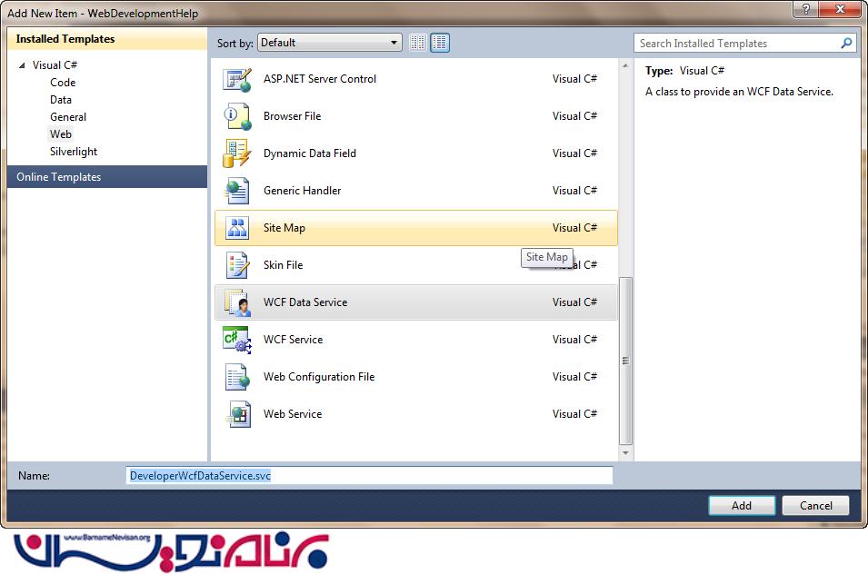 تا این مرحله برنامه خود را برای ایجاد یک WCF Data Service سازگار نمودیم. حال یک WCF Data Service ایجاد می کنیم. برای این کار روی نام پروژه کلیک کرده و Add New Item را انتخاب و یک WCF Data Service را اضافه می کنیم.