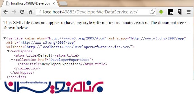 اگر فایل WCF را انتخاب کرده و برنامه را اجرا کنیم، مرورگر باز شده و ما را به آدرس http://localhost:/WCFDataFilename.svc هدایت می کند و فایل XML ای نمایش داده می شود که عنوان آن نام Entity است که قبلا ایجاد کرده ایم.