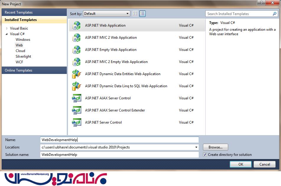 ویژوال استودیو را باز کرده و یک پروژه از نوع Asp.Net Web Application با زبان انتخابی خود (#C یا VB) می سازیم، که ما در اینجا #C را انتخاب کردیم.