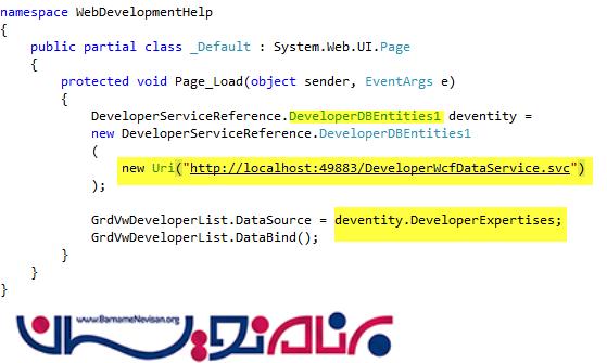 برای سرویس ارجاع داده شده یک نمونه می سازیم، آدرس Data Service در حال اجرا را قرار می دهیم. Entity را به dataSource مربوط به GridView معرفی و متصل می کنیم.