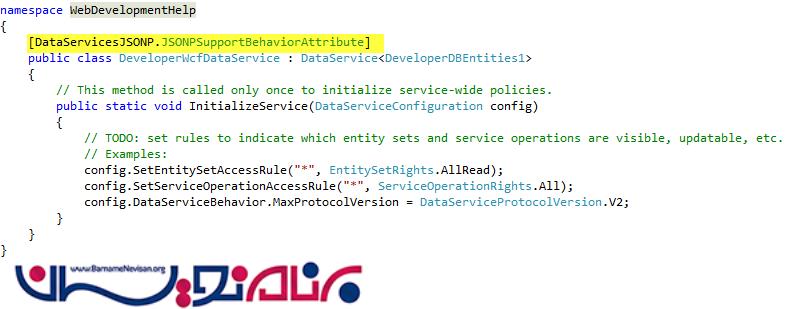 JSON از نظر برنامه نویسی راحت تر خوانده می شود و از XML نیز سریعتر است. برای دست یابی به داده ها در فرمت JSON به یک کلاس ویژه به نام JSONPSupportBehaviour.cs نیاز داریم. این فایل را به پروژه خود include کرده و تنها کلاس Data Service را با JSONSupportBehaviourAttribute تغییر می دهیم و به شکل دلخواه درمی آوریم.
