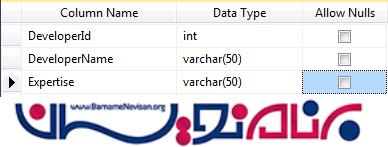 پس از ایجاد پروژه، به یک Data-Model نیاز داریم که در اختیار ما قرار گرفته است. بنابراین، یک Database ایجاد می کنیم. روی فولدر App_Data راست کلیک کرده و یک Database ایجاد می کنیم و جدولی به شکل زیر در آن تعریف می کنیم.