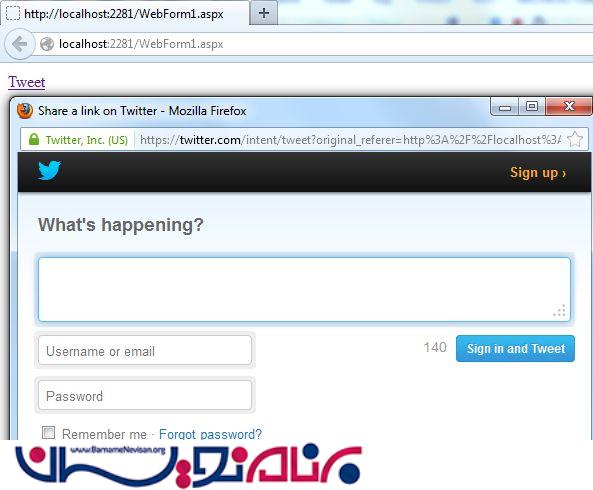 اخیرا اغلب ما روزانه به Twitter سر می زنیم و مطالبی را روی آن به اشتراک می گذاریم، می توانیم امکان اشتراک Twitter را در وب سایت خود فراهم کنیم که کاربران را مدت بیشتری در سایت نگه داریم، و این کار می تواند به وسیله امکان به اشتراک گذاری مطالب با استفاده از یک Popup window باشد. در ادامه یک برنامه ساده ایجاد می کنیم تا نشان دهیم که چگونه می توان با استفاده از یک popup window، مطلبی را روی Twitter به اشتراک بگذاریم.